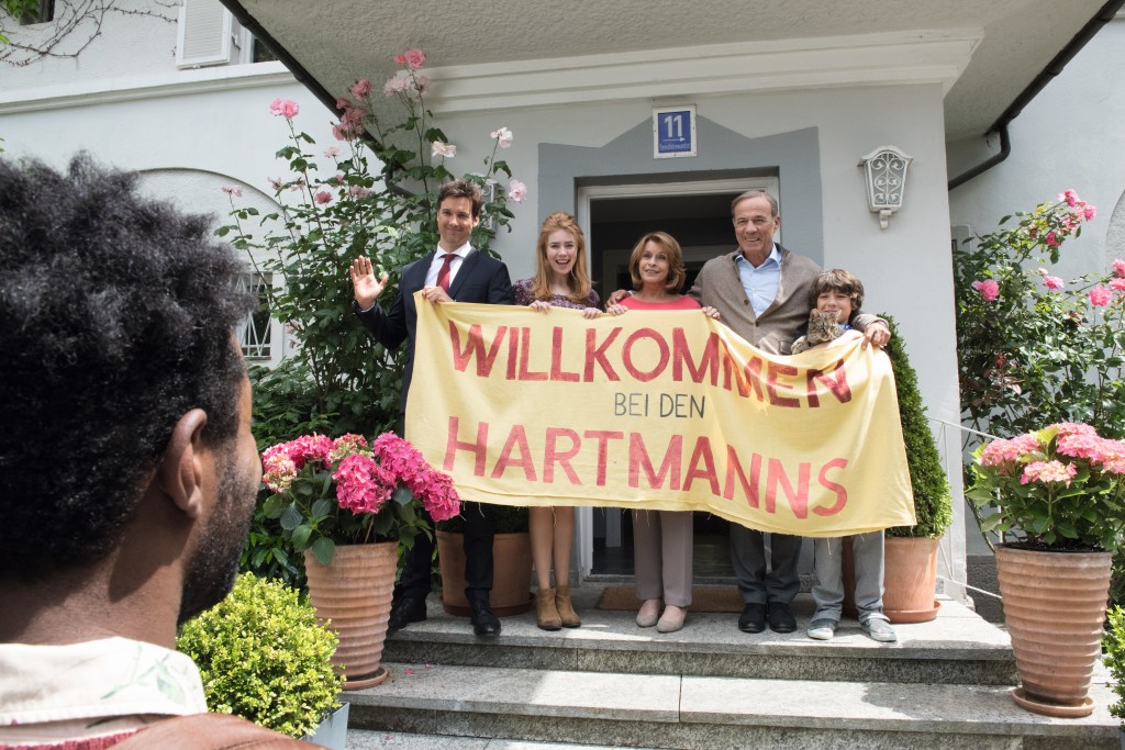 Wie vieles im Zusammenhang mit der Flüchtlingspolitik kam es auch im Zusammenhang mit dem Film zu einem kleinen Fauxpas. So gab es in den Social Media Kanälen große Empörung über die ersten Versionen des Filmplakats, denn darauf wurde der belgische Hauptdarsteller Eric Kabongo neben den deutschen Stars wie Senta Berger, Heiner Lauterbach und Elyas M’barek einfach nicht erwähnt. Inzwischen hat der Filmverleih reagiert und die Werbemittel anpassen und um den Zusatz „Prädikat wertvoll“ vergeben von der Deutschen Film- und Medienbewertung ergänzen lassen. Um was geht es eigentlich im Film genau? Die Münchener Familie Hartmann lebt ein beschauliches Leben. Mutter Angelika (Senta Berger) ist in Pension und hat nach dem Auszug der beiden Kinder Sofie und Philipp des Öfteren Langweile, ihr Mann Richard (Heiner Lauterbacht) verbringt lieber Zeit auf Arbeit im OP-Saal und lässt sich von Freund Sascha (Uwe Ochsenknecht) „jung spritzen“ und amüsiert sich mit jüngeren Frauen. So beschließt Mutter Angelika nach einem Besuch im Flüchtlingsheim sich sozial zu engagieren und einen Flüchtling, klar, gegen den Willen ihres Mannes aufzunehmen. Typisch deutsch endet die Auswahl eines geeigneten Flüchtlings in einer Art „ Deutschland sucht den Super-Flüchtling“ – Casting, denn dieser sollte laut den Hartmanns keine Großfamilie mitbringen, bereits deutsch sprechen können und wirklich richtig verfolgt sein. Die Wahl fällt somit auf den aus Nigeria stammenden Diallo (Eric Kabongo), welcher aus Schutz vor dem islamistischen Terror nach Deutschland geflohen ist. Trotz dessen ist nicht klar, ob sein Asylantrag genehmigt wird – die zwei Wochen bis zur Entscheidung verbringt er nun bei der Familie Hartmann.