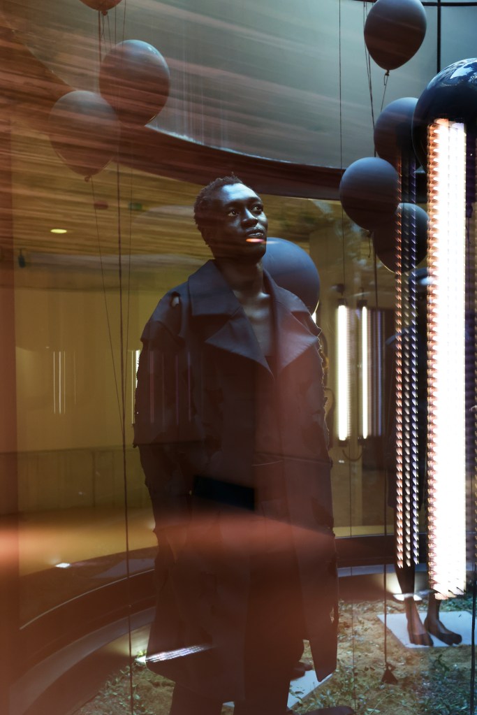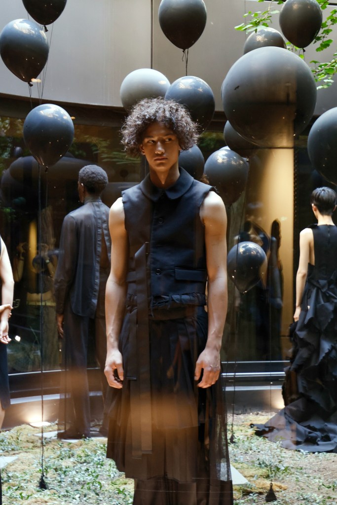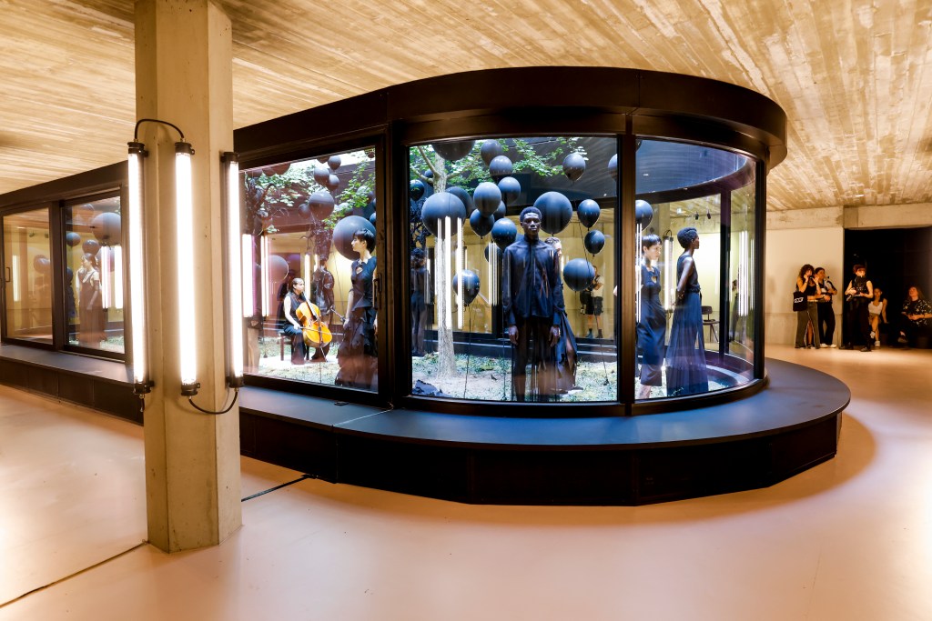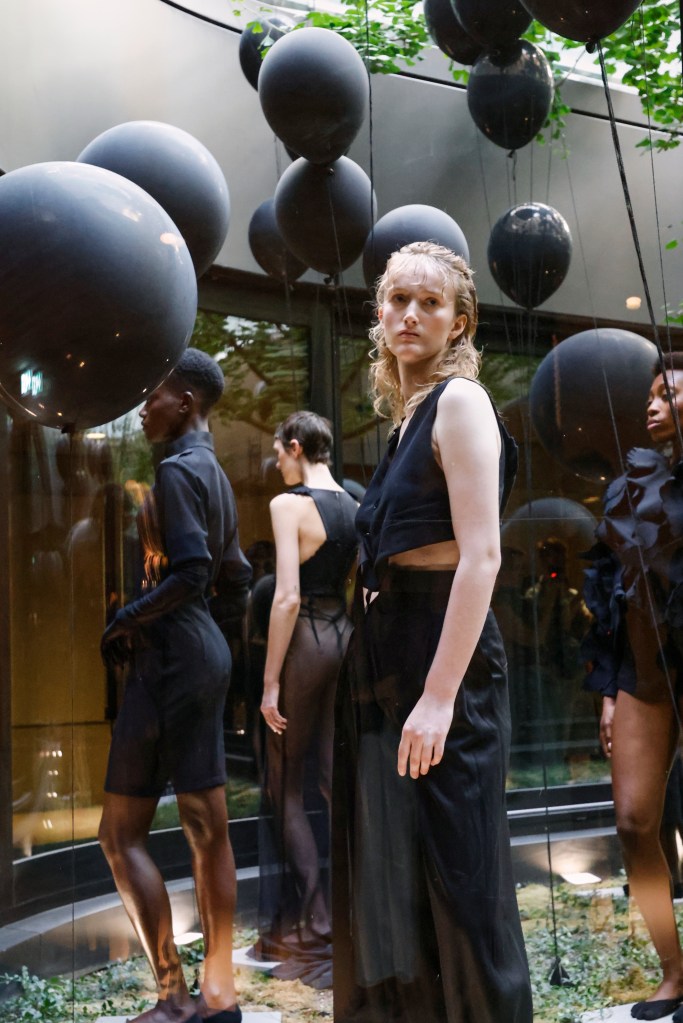 In der aktuellen Kollektion “Concrete Jungle” verschmelzen die Natur, verkörpert durch Vögel, und die raue und inspirierende Ästhetik der Brutalismus-Architektur zu einer eindrucksvollen Darstellung. Mit Anlehnung an Alfred Hitchcocks “Die Vögel” tauchen in der Kollektion immer wieder Vögel auf. Sie sind als gewebter Jacquardstoff in Tops und Kleidern eingearbeitet oder aus robustem Baumwollstoff ausgeschnitten. Ein bodenlanges Kleid vermittelt dabei den Eindruck, dass die Vögel jeden Moment davonfliegen könnten. Inspiriert von Alfred Hitchcocks “Die Vögel” werden in der Kollektion immer wieder Vögel präsentiert. Sie erscheinen als kunstvoll gewebter Jacquardstoff in Tops und Kleidern oder sind aus robustem Baumwollstoff ausgeschnitten. Ein bodenlanges Kleid erzeugt dabei den fesselnden Eindruck, dass die Vögel jeden Moment abheben könnten. Die 18 Looks der neuen Kollektion wurden im Acht Berlin Lichthof präsentiert, wo die Models wie in einem Aquarium ausgestellt waren. Auffällige Headpieces, die an Bäume erinnerten, waren mit fliegenden schwarzen Heliumballons verbunden, die vom Lichtatrium bis in den Hof hinaufragten.