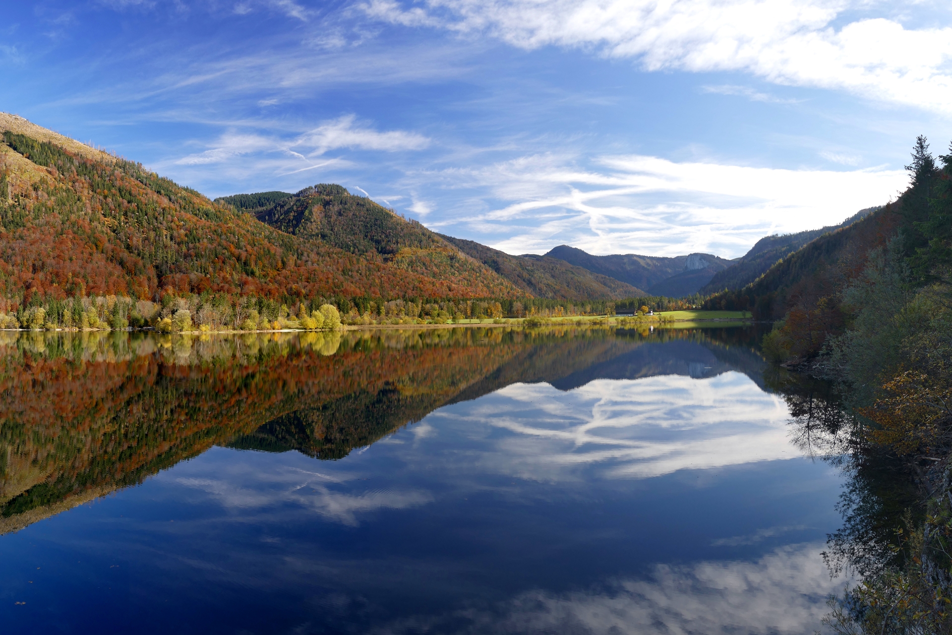Am nächsten Tag stand ein gemütlicher Spaziergang um den Hintersee auf dem Plan. Der See, der nur wenige Gehminuten vom Hotel entfernt liegt, ist für mich einer der schönsten Plätze im Salzkammergut. Umgeben von hohen Felswänden und dichten Wäldern wirkt der See im Herbst noch beeindruckender, da sich die bunten Bäume malerisch im klaren Wasser spiegeln. Der Rundweg um den See ist knapp 2,5 Kilometer lang und eignet sich perfekt für einen entspannten Spaziergang – auch unser Hund hatte hier viel Spaß. Es gibt immer wieder kleine Stellen, an denen man verweilen und die Aussicht genießen kann. Besonders beeindruckend war das leise Rauschen des Windes durch die bunten Blätter und die absolute Stille, die nur hin und wieder von Vogelgezwitscher unterbrochen wurde. Für mich ist der Hintersee im Herbst ein echtes Paradies für Naturliebhaber.